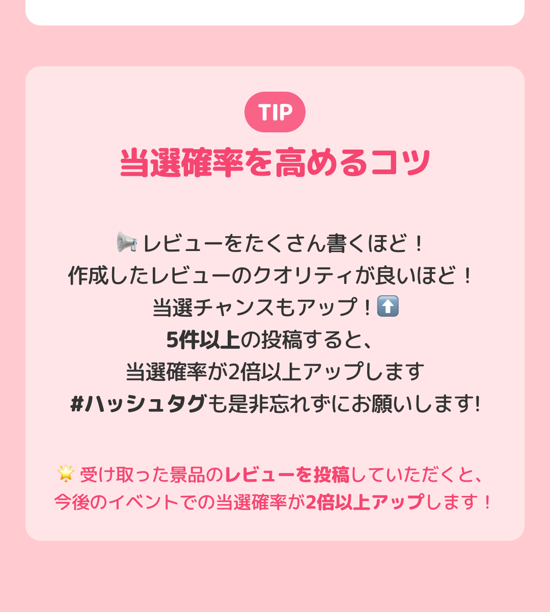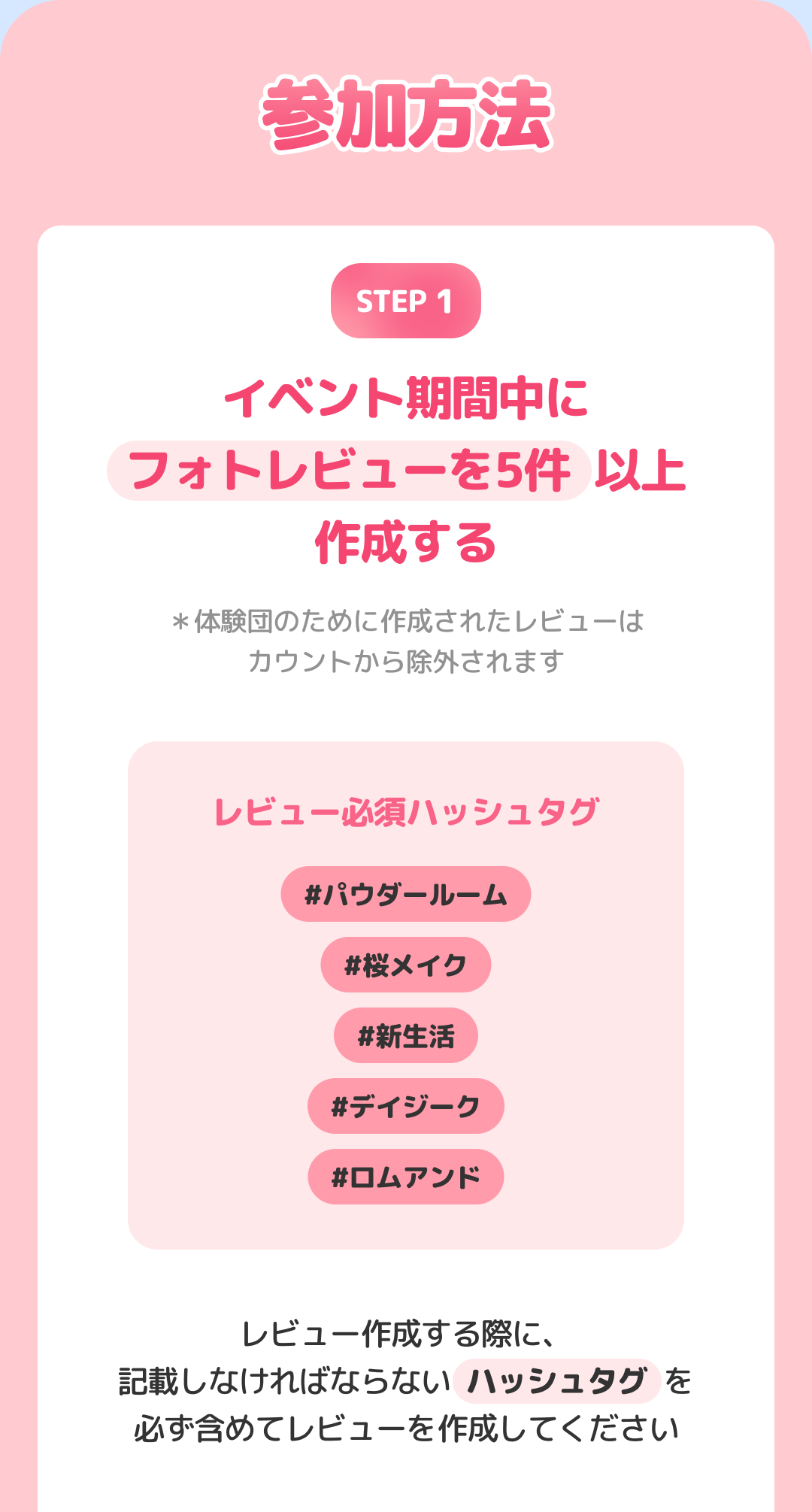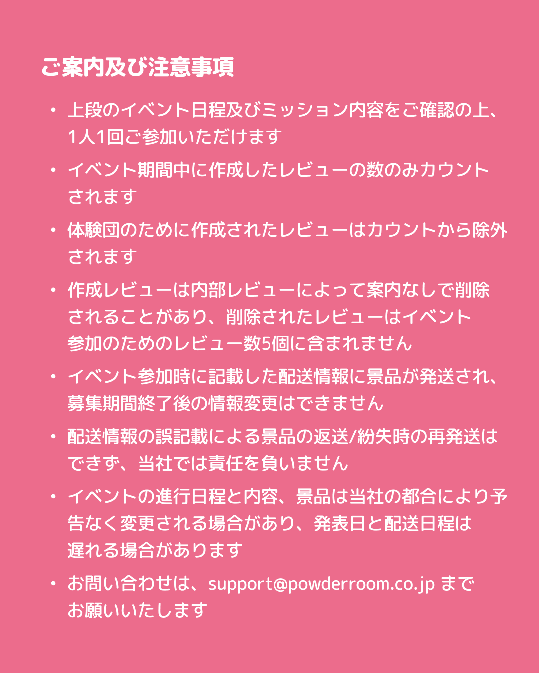 • イベントを通して作成された商品レビュー(文章、イメージ、動画 等)はPowderroom JPと商品提供ブランドのマーケティングに活用されることがあります。