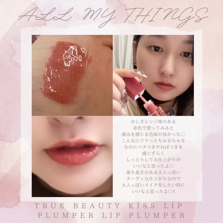 @allmythings_jp さんの トゥルービューティーキスリッププランパー #09 Chill プランパー効果のある リップなのでぷっくりとした仕上がりに 期待のできるリップ! チップは少し不思議な カーブ?角度?が着いているんだけど これがわたし的には 塗りやすくて良かった!! モケモケなので 量も調整しやすくお気に入り! ピリピリ感はそこまで強くは 感じずスーッとした ピリッと感だったので 痛みが弱い私でも大丈夫だった! 少しオレンジ味のある 赤色で塗ってみると 深みを感じる色味が良かった〇 こんなにツヤっとちゅるちゅる なのにベタつきやねばつきを 感じずらく しっとりしてる仕上がりが いいなと思ったよ〇 落ち着きのある大人っぽい ヌーディな仕上がりなので 大人っぽいメイクをしたい時に いいなと思ったよ〇!! #06 EVERYDAY ピリピリ感やぷっくり感は 色つきよりも強く感じて 5~10分はいたああああいっ!! 熱いー!!って思ってたけど ぷっくり感が強く仕上がって 縦じわが軽減されるのが嬉しい〇 そして透明なので ティントや自分の手持ちのリップに 合わせて使うことが出来るのも 便利でいいなと思ったよ!! 色つきじゃないので 毎日使えてすごくいいなと思ったよ〇 #PR#allmythings#女神降臨 #女神降臨リッププランパー #リッププランパーすいせん #オールマイシングス #パウダールームプレゼント