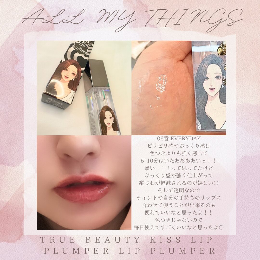 非・現・実・的なボリュームリップ ALL MY THINGS トゥルービューティキス リッププランパー 6色の既存カラーの人気に、加えて新色が誕生したから、こちらもチェックしてみてね 2種類紹介するね。 05 GIRLS NIGHT 女子会の主人公になれちゃうオーロラベース 06 EVERYDAY 毎日の女神降臨のためのクリアベース 強カプランパーで他社製品よりブランプ効果が強い 痛みに弱い方は少量の使用でしてみてね ↓ピリピリ感触がドラマティックなボリューム唇へ 今回使った05と06は色はなし ▶オールマイシングス オールマイティングストゥルー ビューティーキスリッププランパー #05 GIRLS NIGHT #06 EVERYDAY 3/20に日本で放送されたドラマ、 女神降臨のイラストがパケになってるよ #05 GIRLS NIGHT 青ラメ、ピンクラメ、多彩なラメが織り交ざった輝きが唇を彩るプランパー #06 EVERYDAY ラメや色がついていない透明プランパー 単品使いでもリップの上から重ねても◎ オールマイシングスのプランパーははじめて使用したけれど、強力過ぎる正直めちゃくちゃ痛い、、 ピリピリ感が他とは一線を超えてる その分唇のボリューム感が桁違い、、 血色が良く見える◎ ただ、唇周辺の肌まで赤くなってしまう・・・ それが少し使う上で悩みかな~ ヒリヒリ感がすごいので痛みに 慣れるのに時間かかる 唇のボリューム、ぷっくり感、ちゅるっとした光沢が欲しい方に。 比較不可 強力なプランピング しっとりとしたリップグロステクスチャ 唇の角質が目立ちにくいので◎