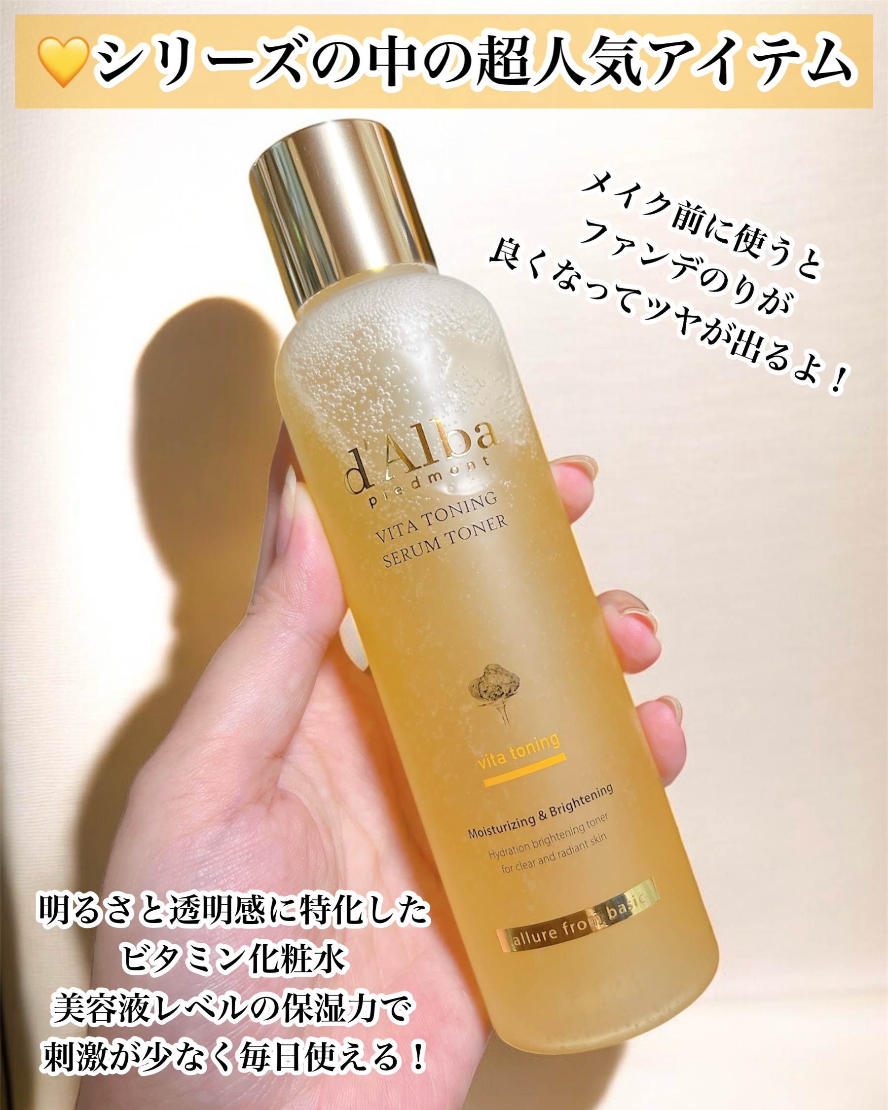 #PR #dAlba @dAlba_japan 高純度のビタミンC&グルタチオン&ナイアシンアミドを配合した「ビタトーニングセラムトナー」リポソーム化したグルタチオンがお肌への浸透をサポート💛とろみのあるウォータリーテクスチャーで素早く浸透して透明感溢れるなめらかツヤ肌に。 #ダルバ #ビタトーニング #ビタミンC #セラムトーナ #パウダールームプレゼント