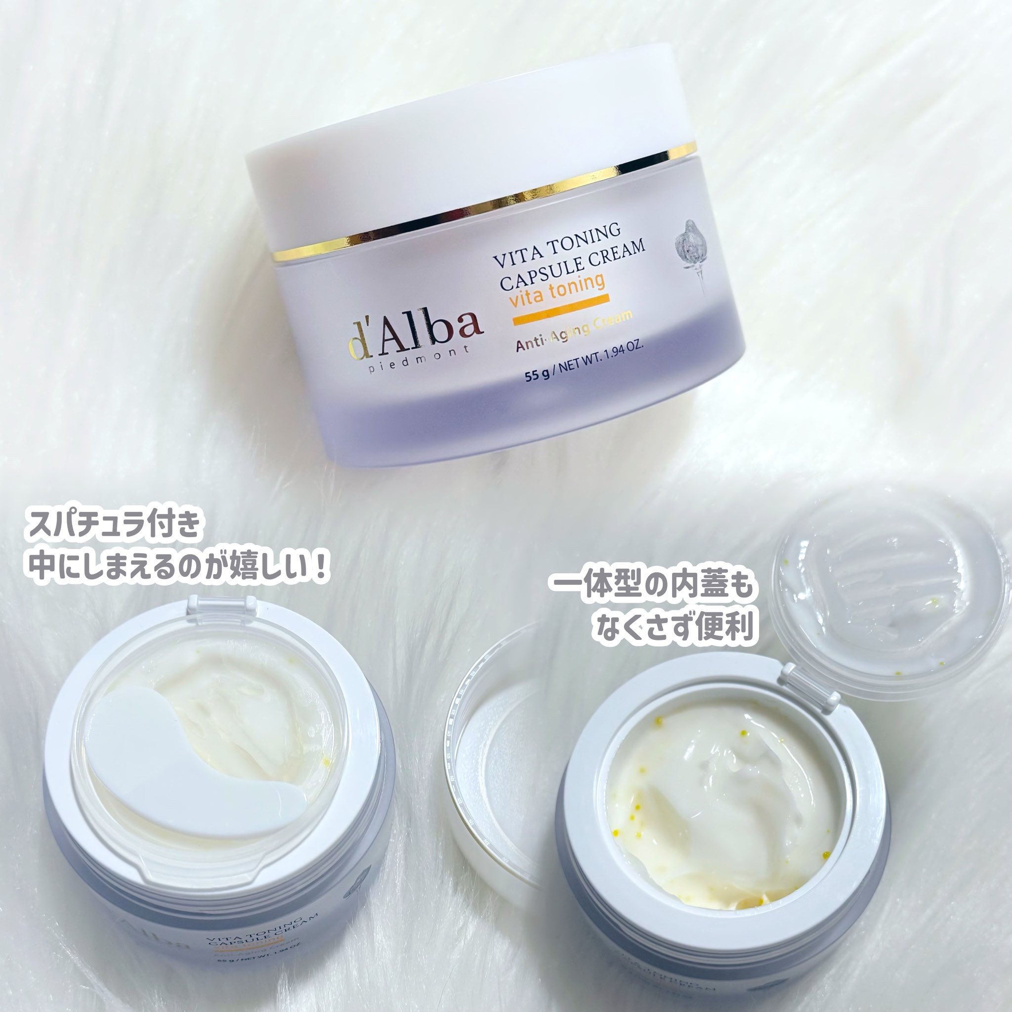 ダルバ ビタトーニング カプセルクリーム なめらかなクリームの中に、つぶつぶのカプセルが入った ダブルテクスチャーが特徴のフェイスクリーム✨ 肌にのばすとカプセルがほどけるようになじみ、 ベタつきにくいのにしっとり感が続く使い心地です。 BASEには、ビタミンC※1・グルタチオン※1・ナイアシンアミド※1、 CAPSULEには、ビタミンK※1・ビタミンE※1を配合。 毎日のスキンケアに取り入れやすい、 うるおいを与えるビタミンケア※2が楽しめます。 個人的には、同シリーズの **「ビタトーニング セラムトナー」**の後に使うのがお気に入り。 化粧水で肌を整えたあとに重ねると、 肌のうるおい感が高まり、なめらかな肌印象に。 軽やかなのにしっとりした仕上がりなので、 朝のメイク前にも夜のスキンケアにも使いやすいのが嬉しいポイント◎ 季節を問わず、毎日の保湿ケアに取り入れたいクリームです🤍 ※1 保湿成分 ※2 うるおいケアによる印象 @dAlba_japan #PR #dAlba #ダルバ #ビタトーニング #ビタミン #カプセルクリーム #パウダールームプレゼント肌トーンアップと保湿が叶うクリーム♡