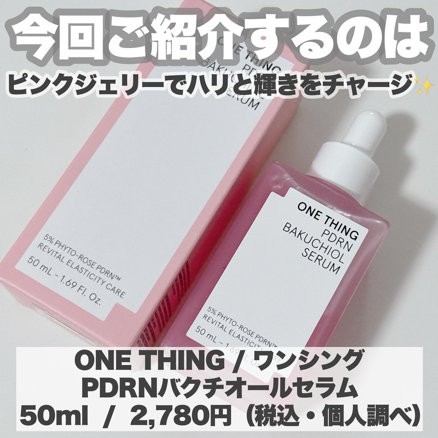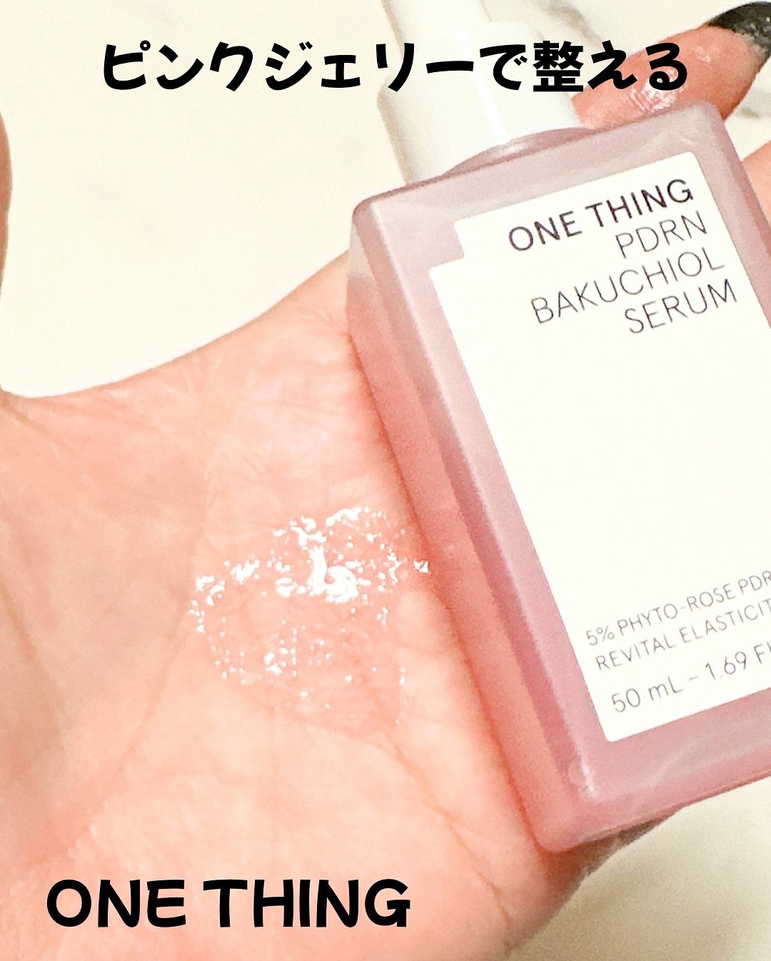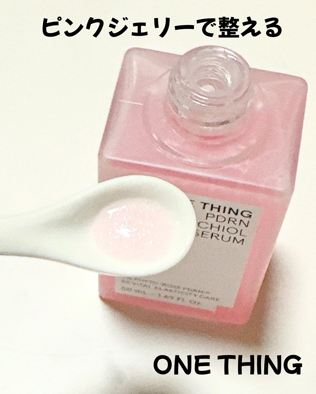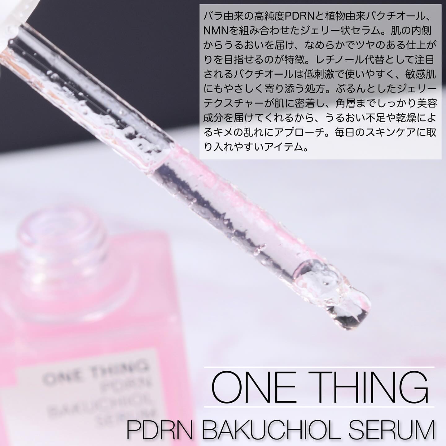 ONE THING PDRNバクチオールセラム ぷるんと弾けるピンクジェリーが肌に 溶け込むたび、ハリと輝きをチャージして くれる美容液🩷ごわつきが気になる肌を 土台から整えて、うるおい・ハリ・ツヤを しっかり届けてくれます💎 キー成分のダマスクローズ由来PDRNは、 人の皮膚組織に近い構造を持ち、肌本来の 力をサポート。内側からふっくらと弾む ようなハリを引き出し、なめらかな肌印象 へ導いてくれます✨ さらに植物由来のバクチオールとNMNが 肌バリアをサポートし、敏感肌でも取り 入れやすいエイジングケアを叶えてくれる! ジェリー状のセラムはみずみずしく軽やか で、肌がすっと飲み込むように浸透※💡 広がるダマスクローズのうるおいが、 透明感と自然なツヤをまとった、思わず 触れたくなるような肌へ導きます✨ ヴィーガン処方・アルコールフリー・ 香料フリーで、敏感肌テスト済みなのも 使いやすいポイントです🌼 ※角質層まで #PR #ワンシング #バラPDRN #PDRN美容液 #メガ割何買う #Qoo10メガ割 #パウダールームプレゼント @onething_official.jp