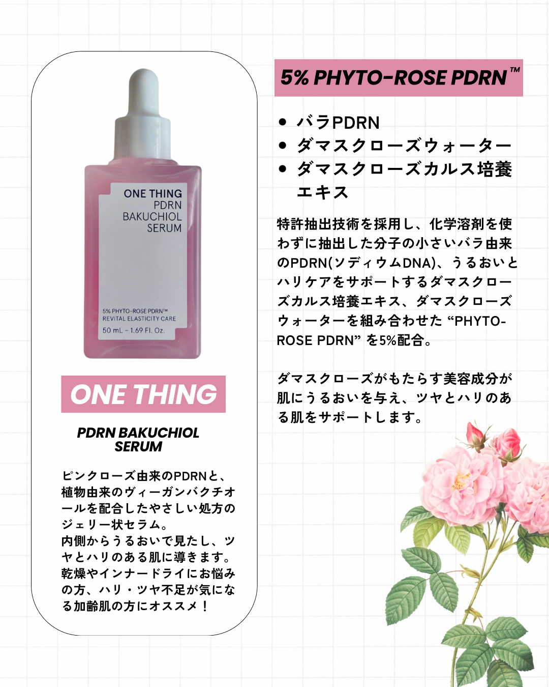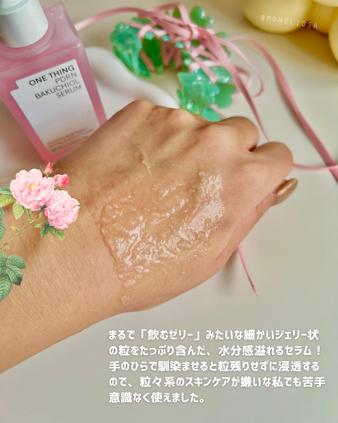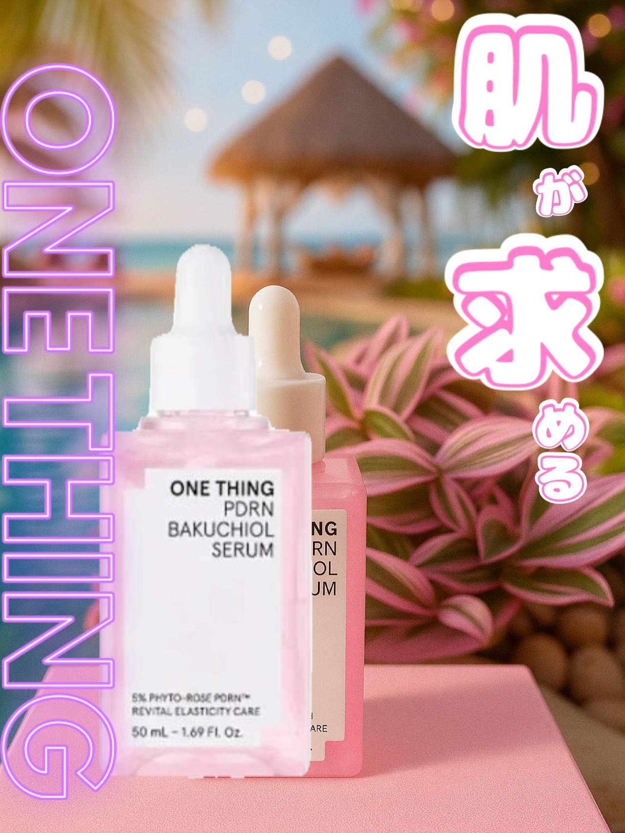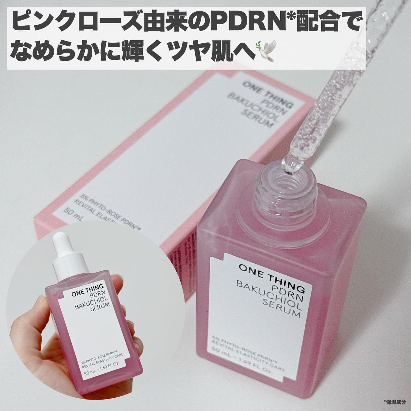 ONE THING PDRNバクチオールセラム ぷるんと弾けるピンクジェリーが肌に 溶け込むたび、ハリと輝きをチャージして くれる美容液🩷ごわつきが気になる肌を 土台から整えて、うるおい・ハリ・ツヤを しっかり届けてくれます💎 キー成分のダマスクローズ由来PDRNは、 人の皮膚組織に近い構造を持ち、肌本来の 力をサポート。内側からふっくらと弾む ようなハリを引き出し、なめらかな肌印象 へ導いてくれます✨ さらに植物由来のバクチオールとNMNが 肌バリアをサポートし、敏感肌でも取り 入れやすいエイジングケアを叶えてくれる! ジェリー状のセラムはみずみずしく軽やか で、肌がすっと飲み込むように浸透※💡 広がるダマスクローズのうるおいが、 透明感と自然なツヤをまとった、思わず 触れたくなるような肌へ導きます✨ ヴィーガン処方・アルコールフリー・ 香料フリーで、敏感肌テスト済みなのも 使いやすいポイントです🌼 ※角質層まで #PR #ワンシング #バラPDRN #PDRN美容液 #メガ割何買う #Qoo10メガ割 #パウダールームプレゼント @onething_official.jp