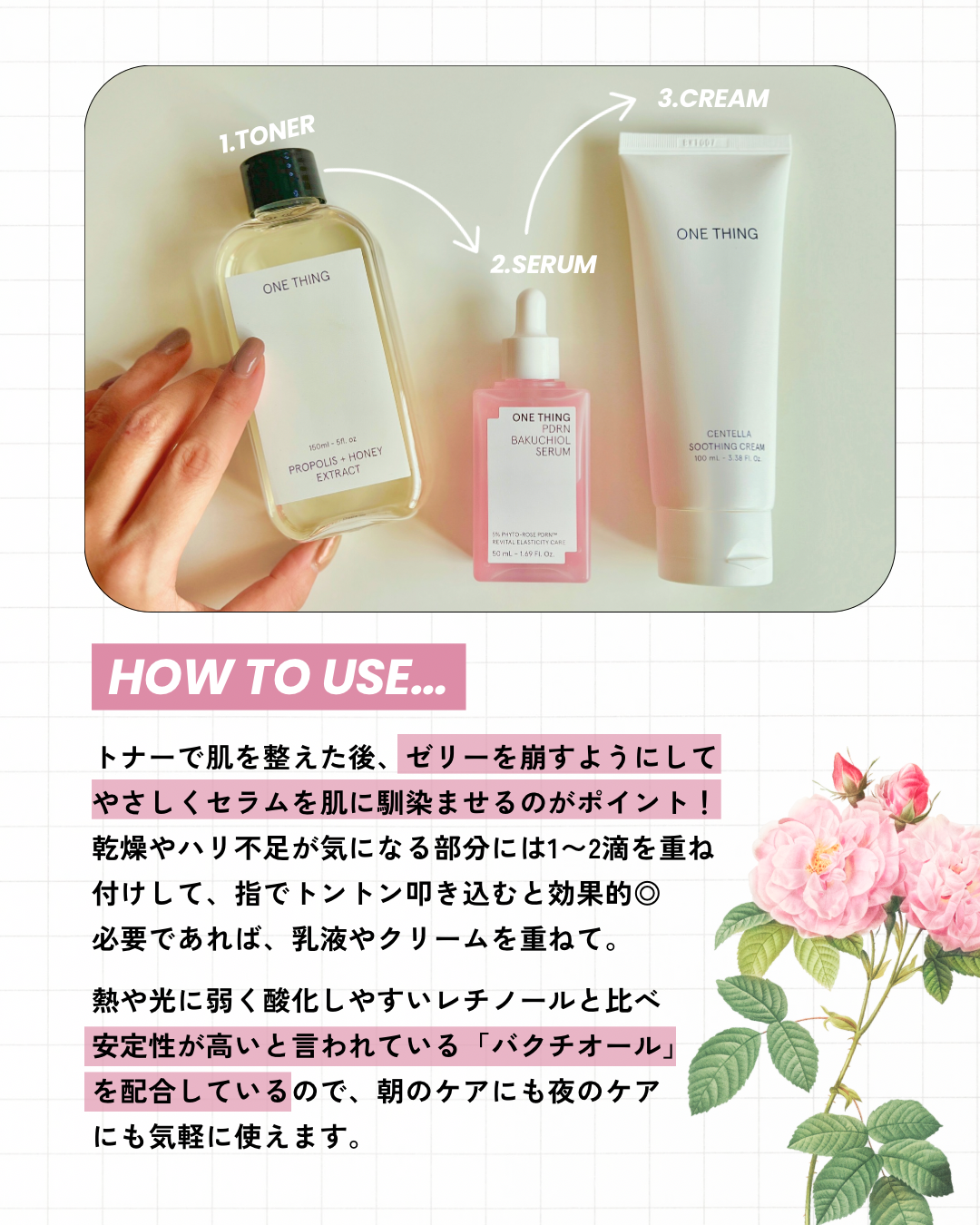 ♡ ♡ ♡ #PR #パウダールーム体験団 #体験団 #韓国コスメ 【ONE THING】「ワンシングPDRNバクチオールセラム」 @onething_official.jp ワンシングの“PDRNバクチオールセラム”は、 (バクチオール:植物由来の整肌成分。) ぷるんと弾けるピンクのジェリーが、肌にとろけて 密着する美容液。 ちょっと疲れて見える朝。鏡の前でふと気づく、 ハリのなさやくすみが気になる時こそ、この1本に 頼りたくなる。 肌と近い構造を持つPDRN*1が、肌のリズムを整えて、 いきいきとした印象へ。そこに植物由来のバクチ オールが加わることで、肌を穏やかに包みながら、 ふっくらとしたハリ感を引き出してくれる。 さらにNMN*3も配合されていて、揺らぎがちな肌を 支えてくれるから、「なんだか今日は調子がいい」 そんな日が、少しずつ増えていく気がする。 ぷるぷるのテクスチャーは、肌に乗せた瞬間とろけ るようになじんで、あと肌はベタつかず、むしろフ ァンデのノリまで変わるのが嬉しい。 香りに頼らず、肌へのやさしさを最優先にした処方 だから、敏感な日にも安心して手に取りたくなる存 在。 毎日のスキンケアが、ちょっと楽しみになる。 そんなジェリー美容液。 *1PDRN:ダマスクローズ由来成分。 *2バクチオール:植物由来の整肌成分。 *3NMN:整肌サポート成分。 @powderroom_jp_event #PR #ワンシング #バラPDRN #PDRN美容液 #メガ割何買う #Qoo10メガ割 #パウダールームプレゼント