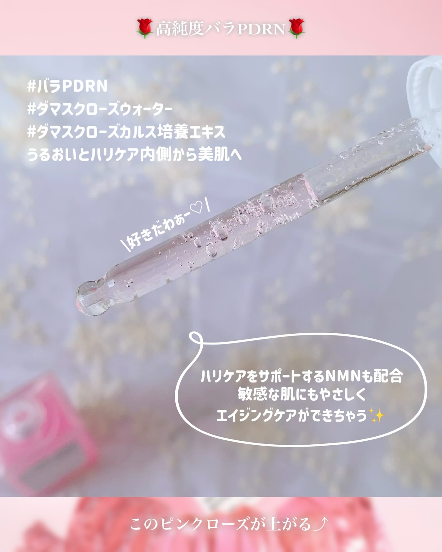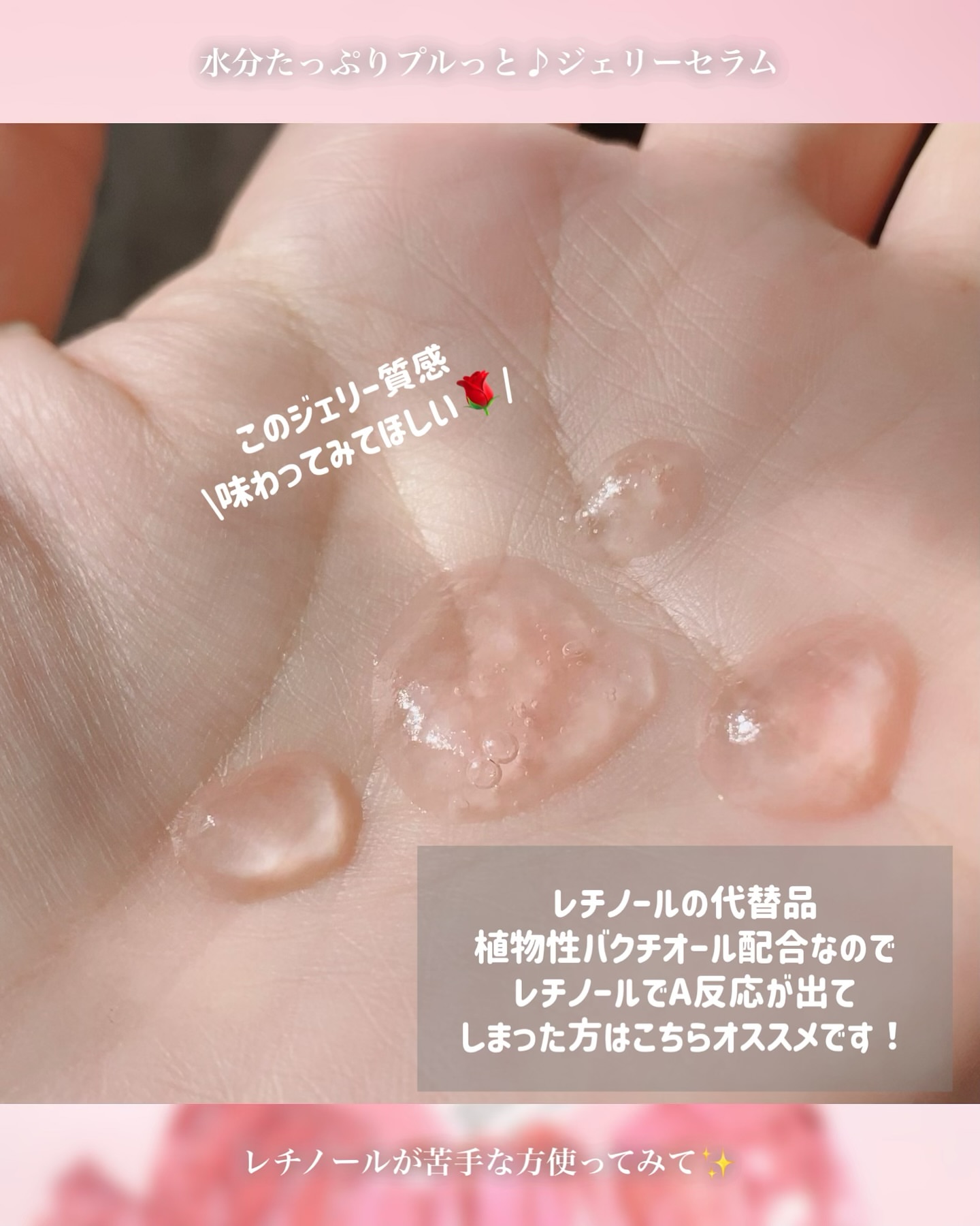 高純度のバラPDRNが使われていたり、ダマスクローズウォーターやダマスクローズカルス培養エキス等が配合されていたり(既にバラ尽くし🌹✨)贅沢なんですが、なんと言っても レチノールの代替品《バクチオール》も配合されてるんです‼️ワー レチノールでA反応が出てしまい困ってる方は、敏感肌さんでも使いやすいように低刺激で作られたバクチオール試してみほしい︎︎⟡ まず特徴的なのが、 ピンクローズ色のジェリー質感美容液ってとこ! 美容液がピンクカラーってだけで女性性活性化しそうだよね♥️ 液が細かく砕けたジェリーなのは驚き💗 肌に馴染ませたらちゃんと馴染むんだわースキィ♡ この美容液はベタベタ質感ではないので、ベタベタスキンケアだと肌が痒くなってきてしまう私でも凄く凄く使いやすかった! 馴染ませ終わるとぷるるん♪肌だよ。 小ジワや肌のハリ感、うるおいが気になってきた方、ぷるぷるお肌ってイイよねって思ってる方に特に響くかなと思いました🫶🏻️ PDRN何がいいのかなー?って悩まれてる方はこちらオススメです︎︎⟡ ■ヴィーガン処方・アルコールフリー・香料フリー・敏感肌テスト済みだよ