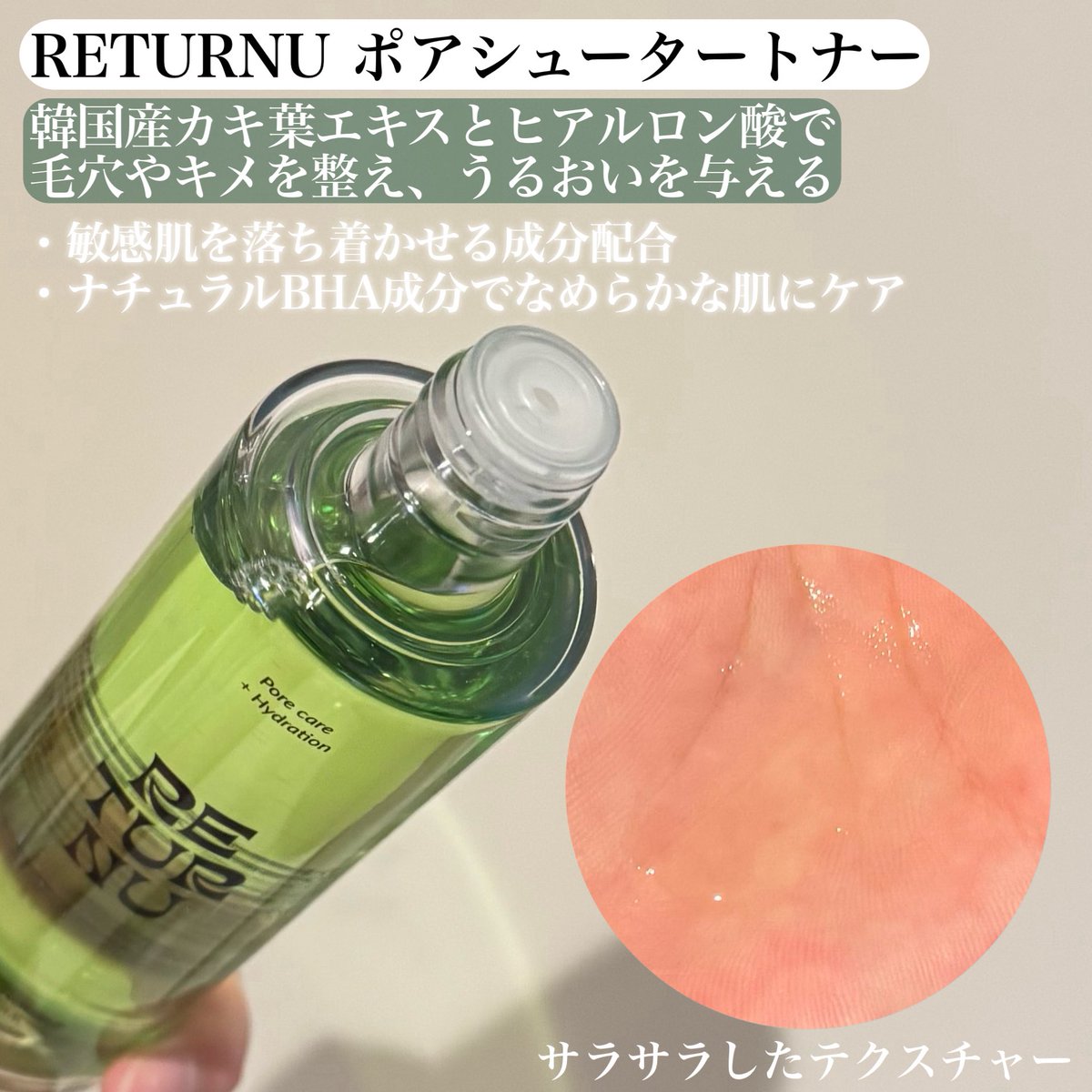 最近使い始めた「リターニュ ポアシュータートナー」✨ 韓国産カキ葉エキスとヒアルロン酸が配合された化粧水で、毛穴まわりやキメの乱れが気になる時のケアにぴったり。 さっぱりしているのに、うるおい感はしっかりあって、洗顔後の肌にすっとなじみます🌿 ナチュラルBHA成分が配合されているから、肌表面をやさしく整えて、なめらかに見せてくれる感じ。使い続けるうちに、メイクのりも自然とよくなってきた気がします。 さらに、敏感肌を落ち着かせる成分も入っているので、肌がゆらぎやすい季節の変わり目にも使いやすいのが嬉しいポイント。とろみは少なく、みずみずしい質感でコットンパックにも◎ 香りはほとんど感じず、刺激も少なめ。スキンケアの最初に使うと、後に使う美容液やクリームのなじみもスムーズで、毎日のケアが心地よくなります。 乾燥や毛穴の目立ちが気になる方、しっかり保湿しつつも軽い使い心地を求めている方におすすめしたい化粧水です。 リターニュ ポアシュータートナーはQoo10で購入可能です☺️ @returnu_jp #PR #リターニュ #毛穴ケア #毛穴 #黒ずみ #化粧水 #パウダールームプレゼント