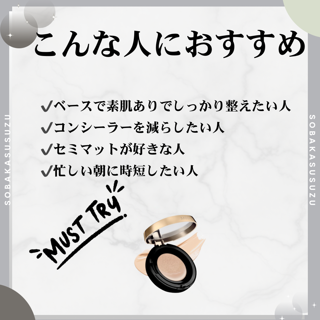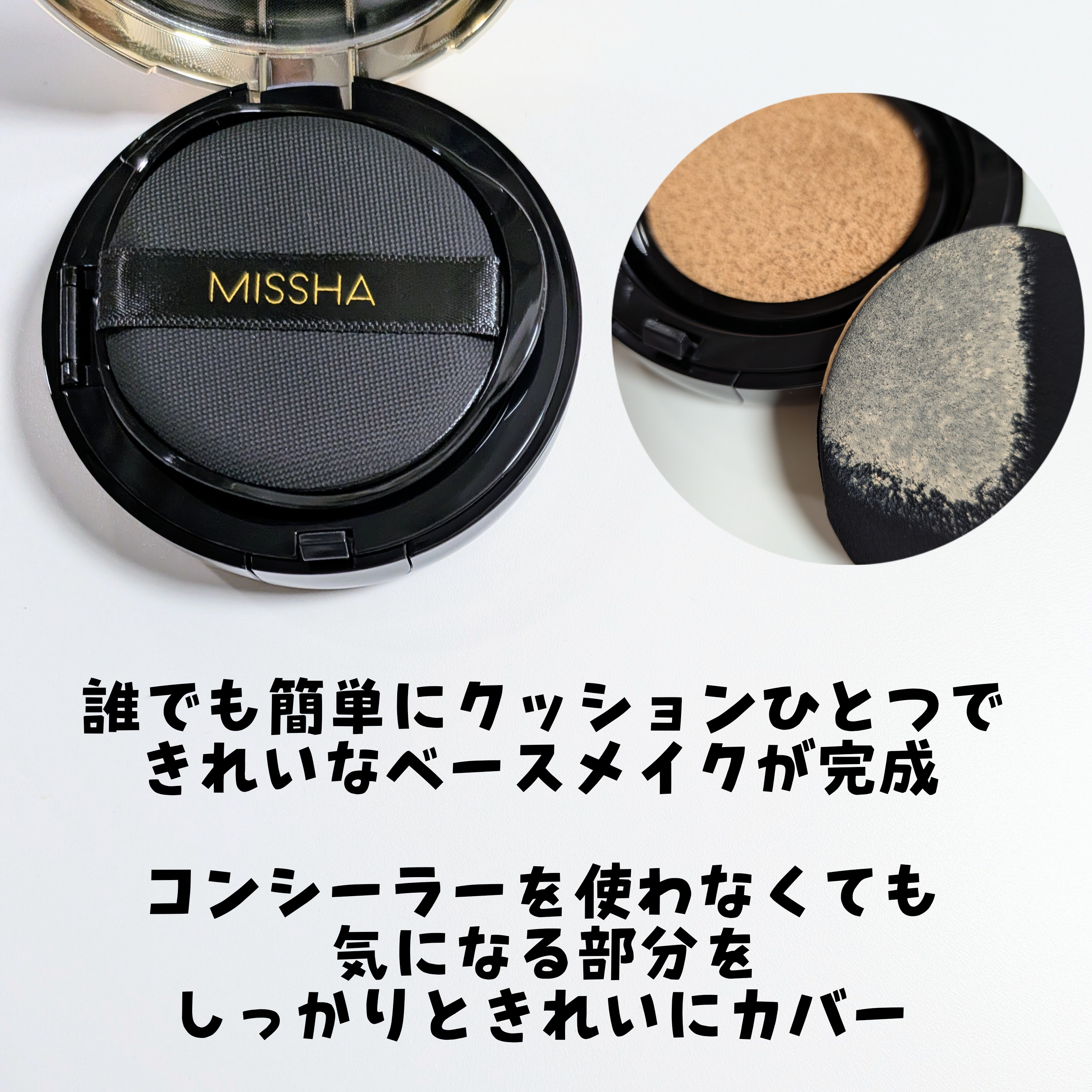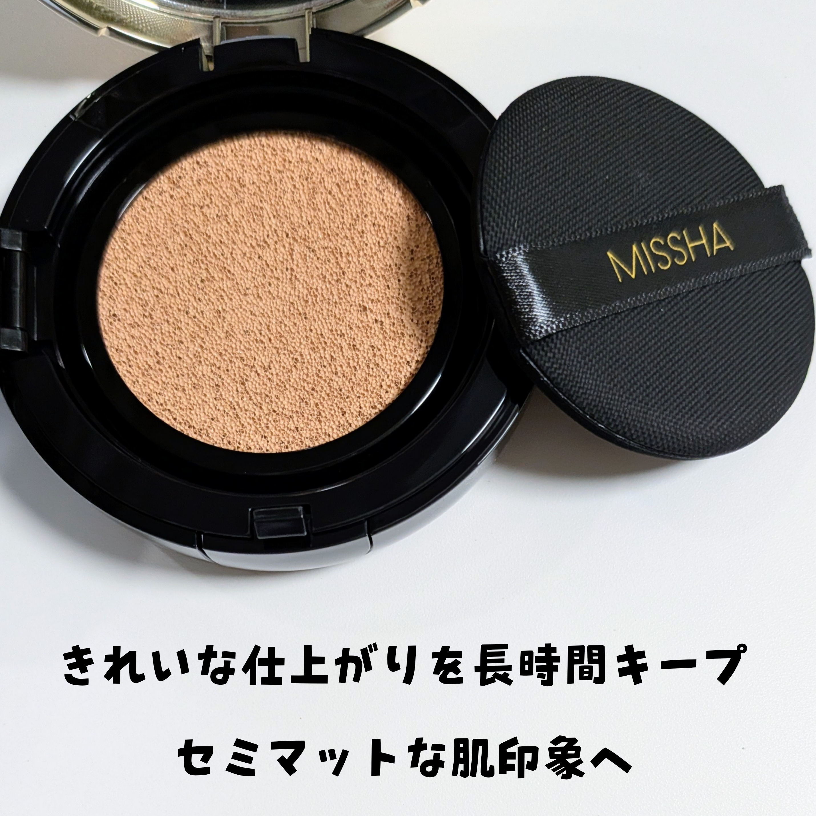 クッションファンデといったら最初にMISSHAを思い浮かべる人も多いはず。 長年にわたって安定の人気を集めていますもんね。 Amazonでは、リフィル商品が継続して上位ランキングされているそうです。 一度使うと手放せなくなるファンデってことですね。 カバー力が高いし、サラッとしたつけ心地。 付属のパフでポンポンするだけで、簡単にプロ並みの仕上がりになるから日常使いしたくなるファンデーションです。 忙しい朝でもパパッと美しいセミマット肌仕上がりのベースメイクが完成するから、めちゃくちゃ助かる! ナイアシンアミドやアデノシンなどの保湿成分が配合されていて、メイクしながらエイジングケア*まで叶えてくれるのも嬉しいポイント。 ドラッグストアなどで手軽に買えるところも魅力だと思います。 🌟SPF50+PA+++ * 年齢に応じたお手入れのこと