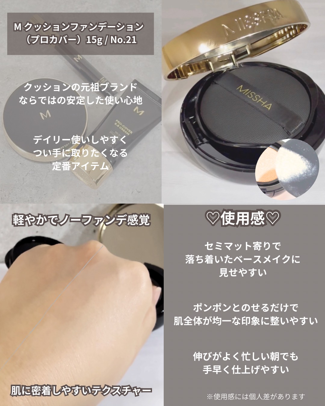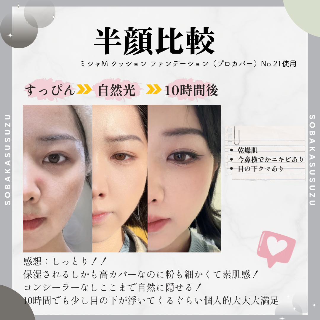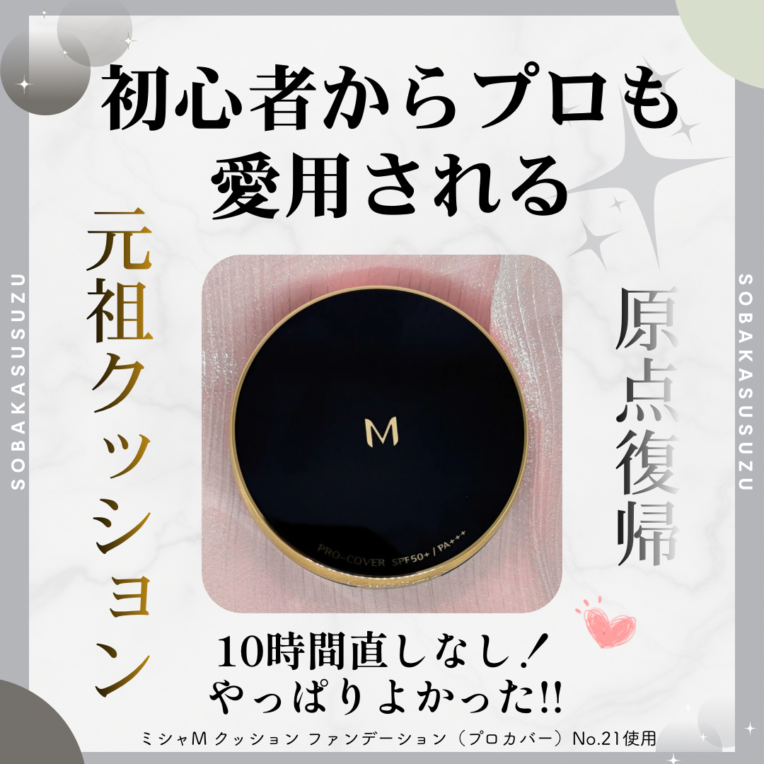 ♡ MISSHA ミシャ M クッション ファンデーション(プロカバー)No.21 @missha.jp さまの商品です🩷 ドラッグストアなどのオフライン店舗で気軽に購入可能だし誰もが一度は目にしたことのある、認知度の高い定番アイテムだよね😍 M クッション ファンデーション プロカバーは伸びも良くて崩れにくいしカバー力もしっかりあるよ🙆♀️ コンシーラーを使わなくても気になる部分をしっかりときれいにカバーしてくれてセミマットな綺麗な仕上がり♥️ 1,000円台で買える価格帯もコスパも良く試してみやすいよね👌 BBクリームも密着感があり綺麗な仕上がりだしコンシーラーも乾燥崩れしなくて使いやすい🥹 安心、安定感が抜群のMISSHAのクッションファンデ!💞 ナイアシンアミド、アデノシンなどエイジングケア保湿成分も配合されているからハリ感のある印象に見せてくれるし大人肌にもぴったり🩷 オススメだよー✨ #PR #ミシャ #ミシャMプロカバークッションファンデ #ミシャMプロカバー #クッションファンデ パウダールームプレゼント