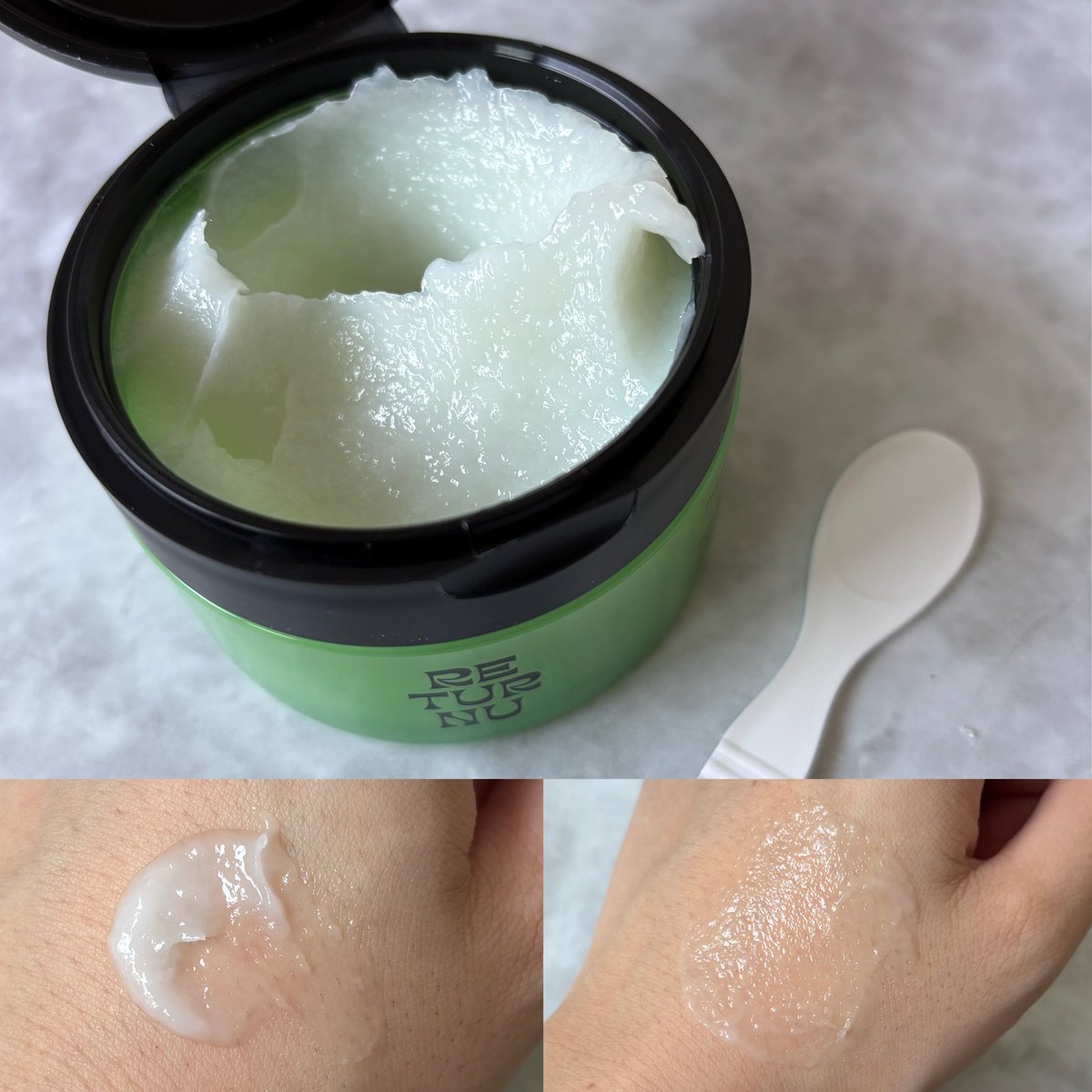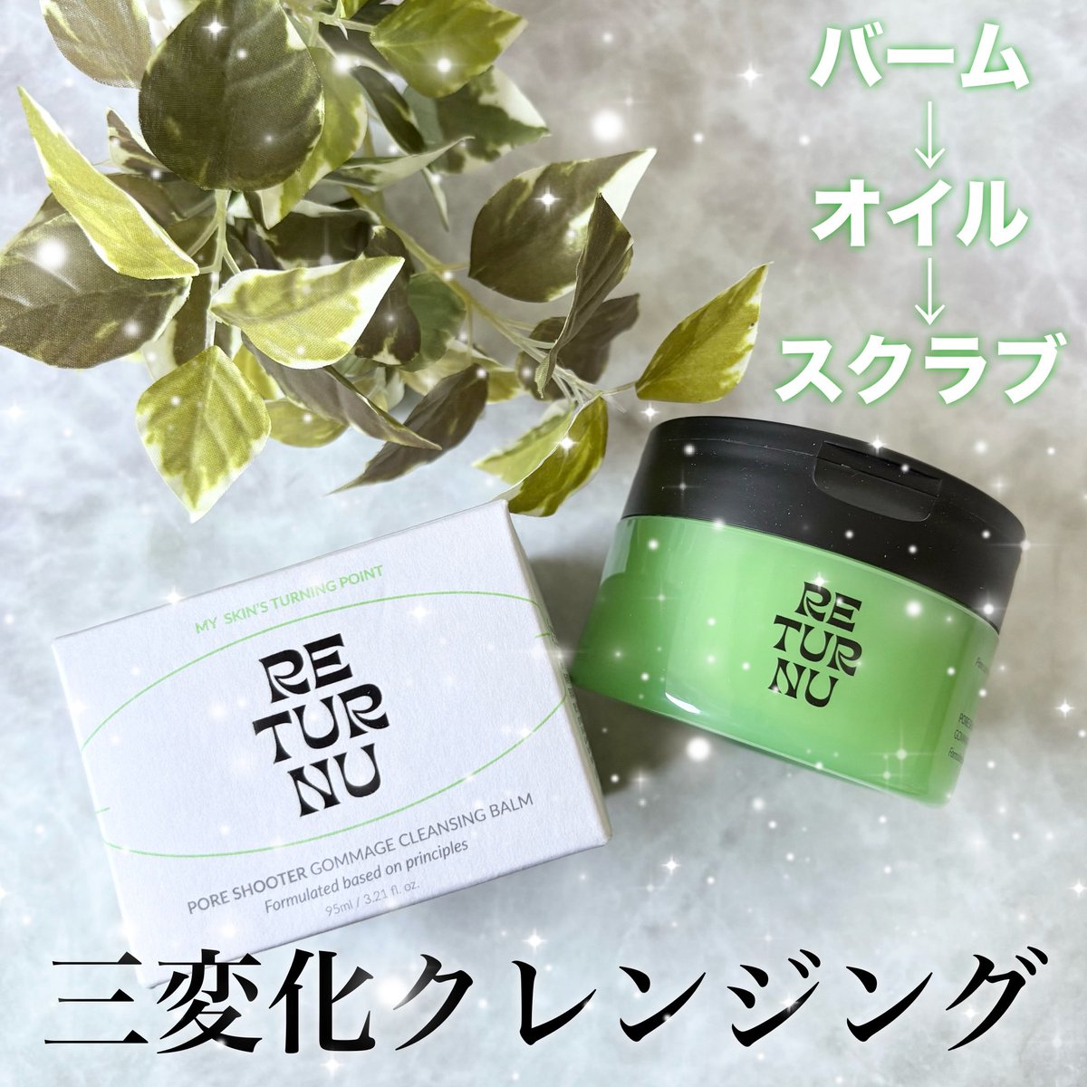 三変化するクレンジング💚柔らかいバーム状のテクスチャーから、メイクとなじませると徐々にオイル状に変わり、水となじませるとスクラブに変化✨濃いメイクもしっかりとオフできて角質ケアもできる優れもの🫶🏻
